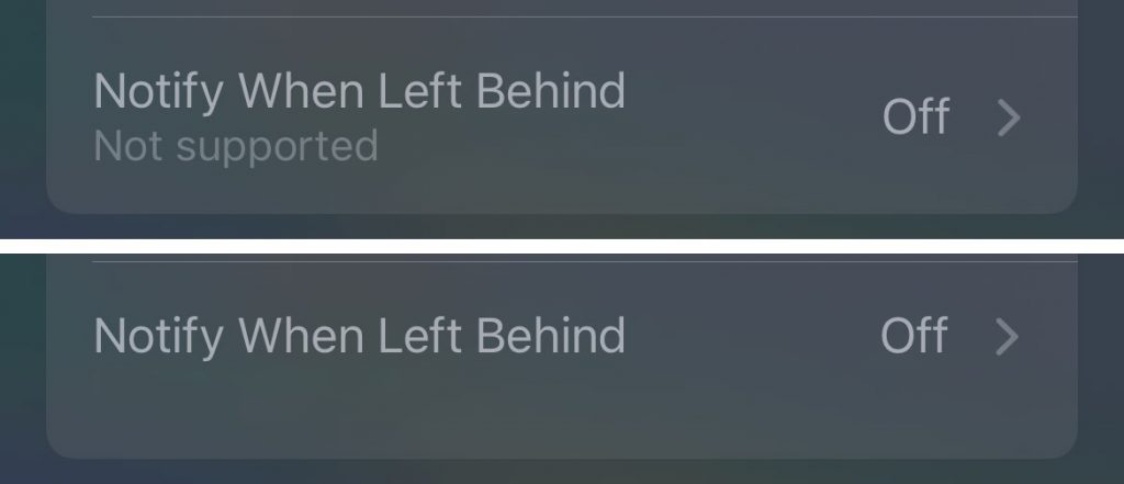When you use an older device that runs an older operating system, the Notify When Left Behind setting is off, grayed out, and may also list the device as “not supported.”