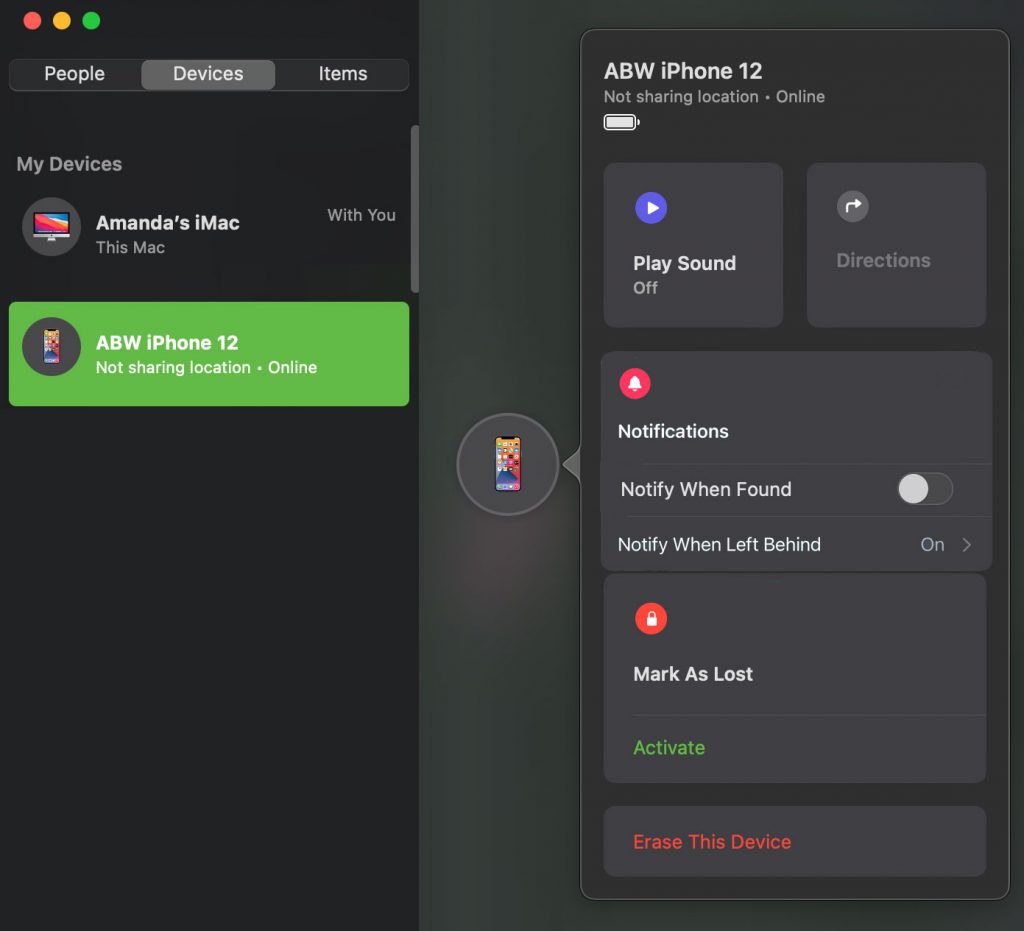 - Choose the Devices tab (for watches, iPhones, Macs, or iPad) or Items tab (for AirTags and Find My Network supported products).
