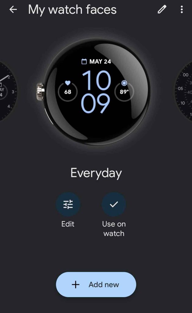 - Swipe left or right to browse available faces, select a new watch face, or tap Add new.