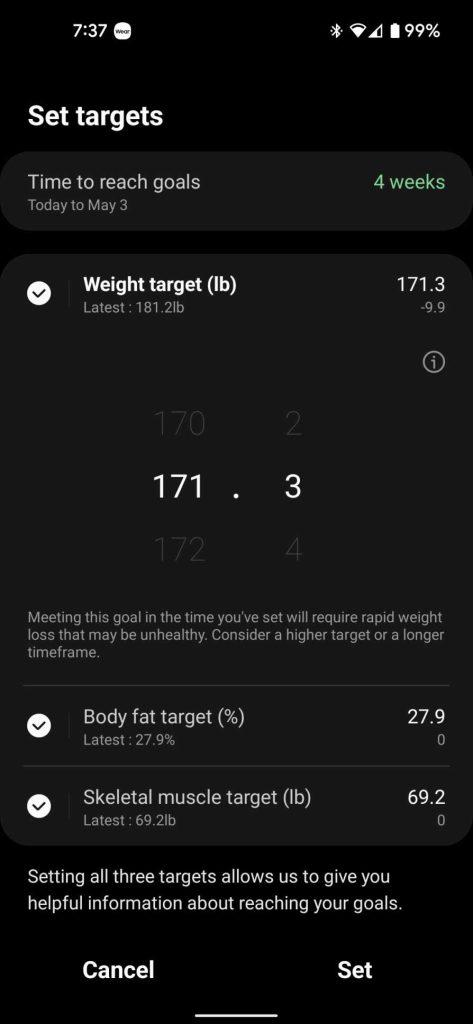 The ‘Set Targets’ feature for body composition on the Samsung Galaxy is a novel feature and appears useful. This keeps users motivated as they work through their training goals.
