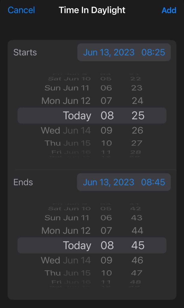 - Add your start and end times for time spent outdoors, then tap Add at the top to save it.