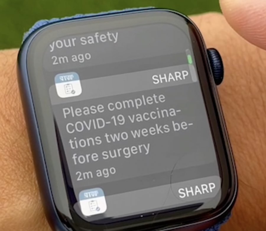 - Incorporates COVID-19 vaccine reminders. Pre-operative patients get reminders on their Apple Watch to complete COVID-19 vaccinations two weeks before surgery. There is a COVID Vaccine care card built into the app that assists patients in getting the vaccinations by providing them with details around where to get the vaccine and more before the surgery.