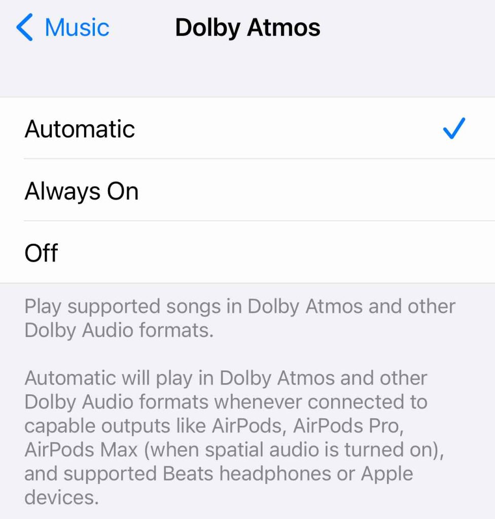 - Go to Settings > Music > Dolby Atmos and verify it’s on and listed as Automatic or Always On.