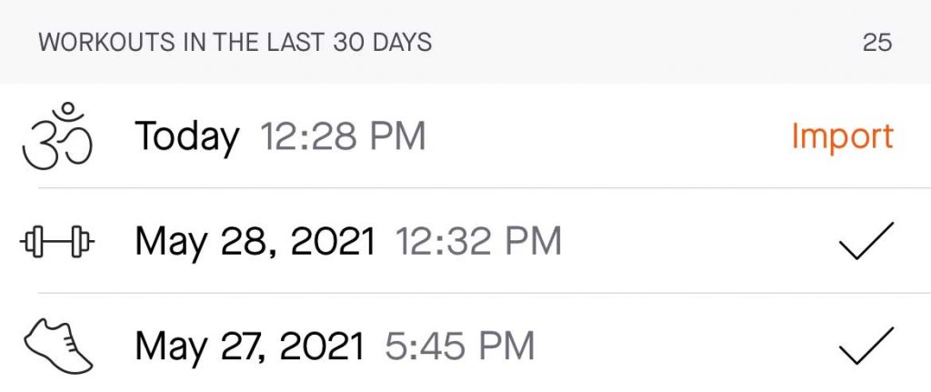 - To import workouts to Strava, tap the Import button next to the workouts data and time. Strava checkmarks each workout that it successfully imported.