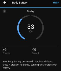 A score of 100 means that you’re well-rested and in good shape as far as fitness. If you run a marathon or perform another intense workout, your Body Battery score will decrease. When it’s low, it means that you might not have the energy to perform a difficult exercise routine.