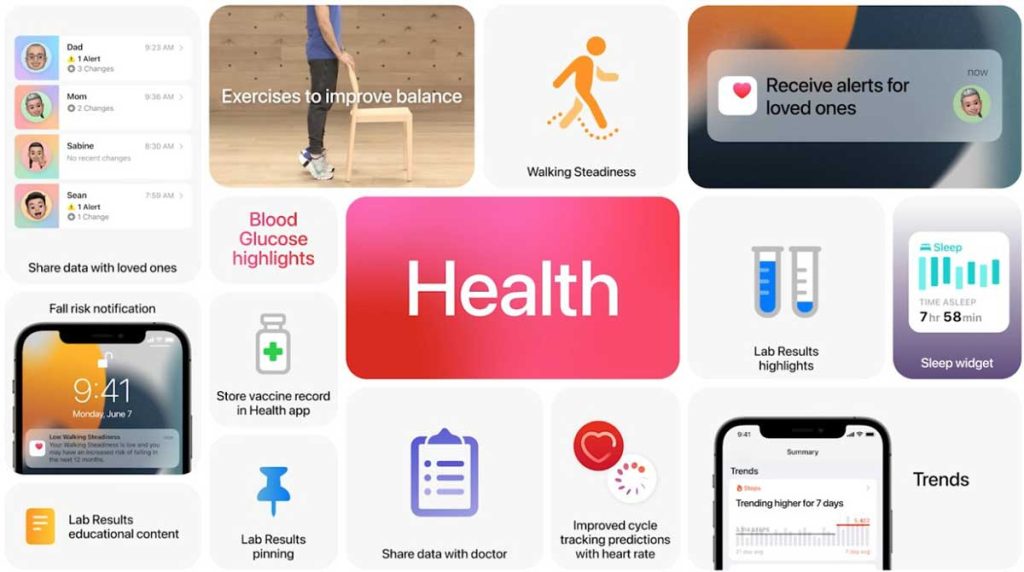 With sharing, family, and caregivers receive important notifications about their loved ones’ health and view things like health alerts, lab results, medications, activity, mobility data, heart rate data, and more in the Apple Health Sharing tab on their iPhone or iPad.