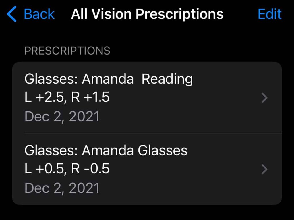 Learn how to add your vision prescription to the Health app in this article: How to add your vision prescription to your iPhone’s Apple Health app.