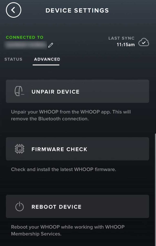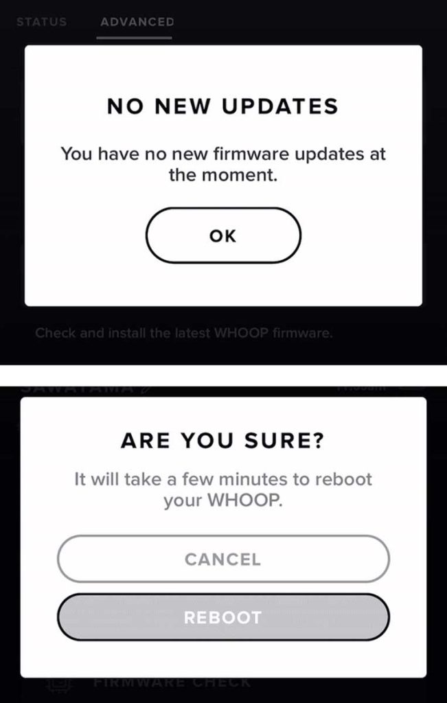 - Choose Firmware Check to see if there is a new firmware update available for your Whoop or choose Reboot Device. Follow and agree to prompts to install new firmware or reboot.